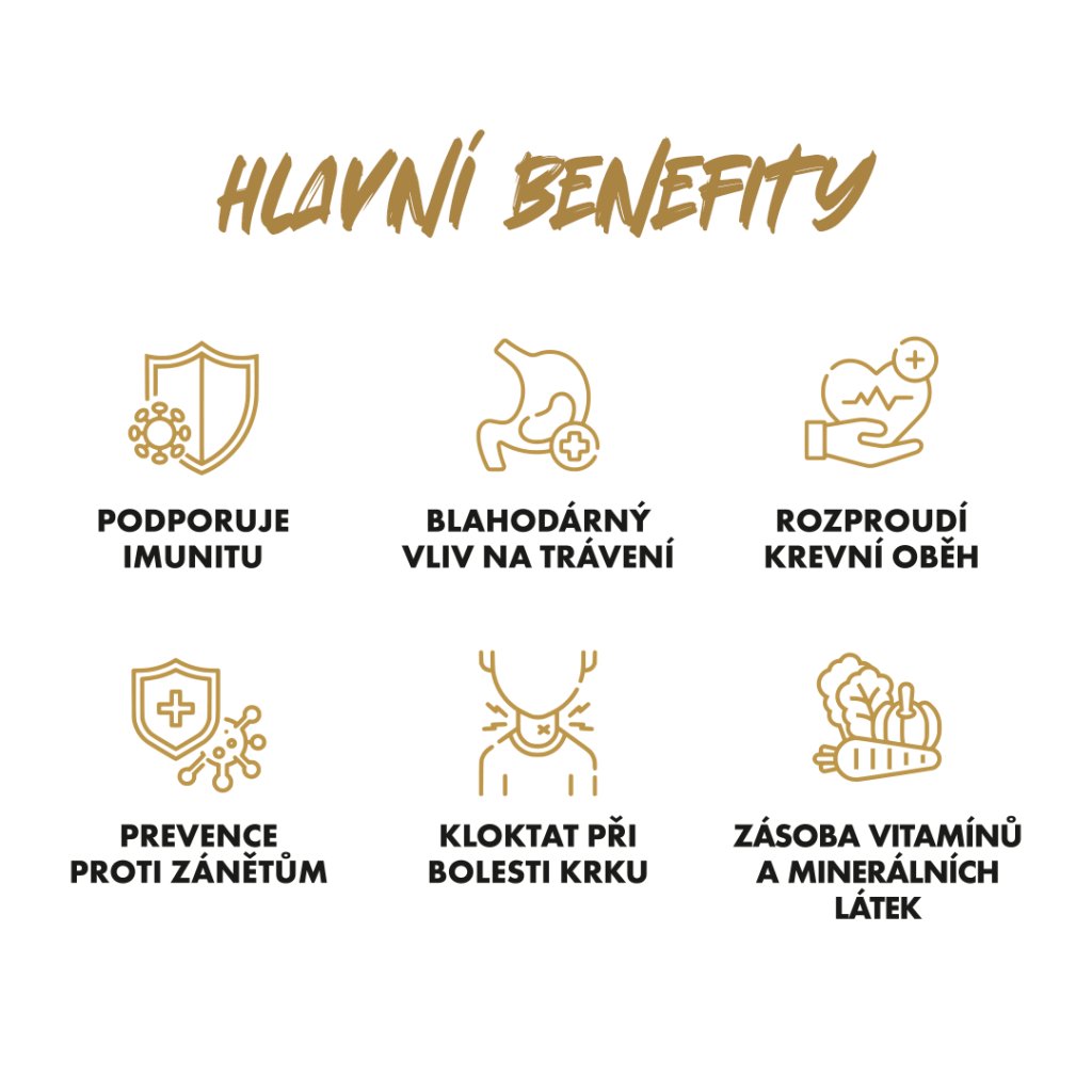 Díky vysokému obsahu zázvoru, citronu a kurkumy působí jako přirozený posilovač imunity, pomáhá tělu bojovat proti nachlazení i únavě a nastartuje metabolismus hned po ránu.